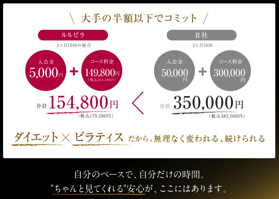 大手では2ヶ月30万円以上が相場ですが、ルルピラではその半額程度で「人生変える」体験を提供可能。